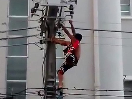 Đoạn video ghi lại khoảnh khắc đáng sợ khi 1 người đàn ông bị điện giật ngã vật xuống đất sau khi trèo lên cột điện để theo dõi bài phát biểu của bà Dilma Rousseff, Tổng thống đang bị đình chỉ của Brazil.