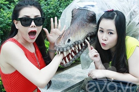 | Trà Ngọc Hằng hốt hoảng vì bị khủng long "nuốt chửng" bàn tay. |