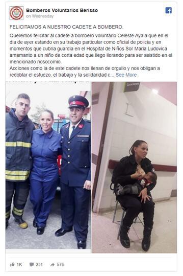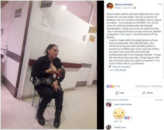 Cô hỏi nhân viên y tế rằng liệu cô có thể ôm đứa bé này và cho nó ăn không. Sau khi nhận được sự đồng ý, cô bế đứa bé ngồi xuống và cởi bộ đồng phục cảnh sát rồi không ngần ngại cho đứa bé đó bú.