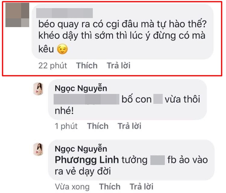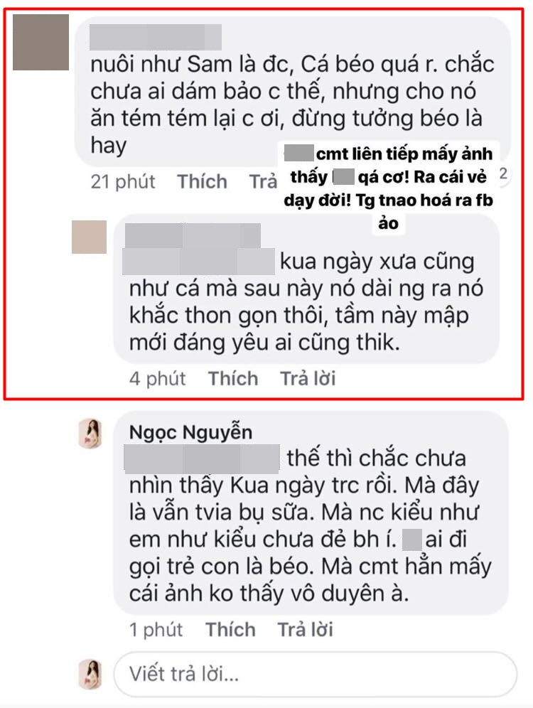 Một tài khoản có tên Phương L. đã liên tiếp bình luận mỉa mai bé Cá nhà Ngọc Mon là "béo quay thì có gì mà tự hào", "đừng tưởng béo là hay"... khiến bà mẹ trẻ phải lên tiếng dằn mặt.