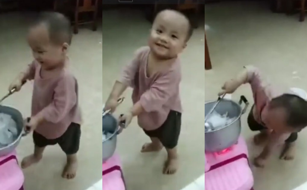 Điều đặc biệt, trong quá trình hất nồi lật đồ, không may miếng đồ ăn bị rơi ra ngoài. Phát hiện ra điều đó, cậu bé con đã bất ngờ cúi xuống và nhặt lên. Thế nhưng, hành động tiếp theo của cậu bé mới đáng chú ý và khiến mọi người phì cười. Cậu bé mặt mũi tỉnh bơ nhặt xong thả lại vào nồi rồi tiếp tục đảo đảo như chưa có chuyện gì xảy ra.