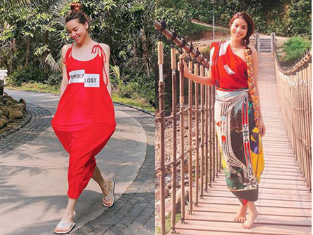 Ngọc Loan cập nhật xu hướng hè với sắc vàng nổi bật từ trang phục đến loạt phụ kiện bắt mắt như băng đô, khuyên tai, kính mắt, túi xách... Người đẹp khoe vòng eo con kiến cùng áo bra kết hợp quần ống rộng họa tiết bắt mắt.