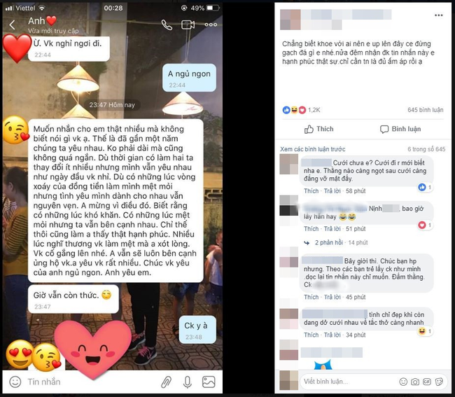 Mới đây, trong một nhóm kín dành cho hội chị em, một cô gái đã chia sẻ đoạn tin nhắn tình cảm mà bạn trai gửi cho mình. Theo đó, bạn trai của N.H. viết: "Muốn nhắn cho em thật nhiều mà không biết nói gì vợ ạ. Thế là đã gần một năm chúng ta yêu nhau. Không phải dài mà cũng không quá ngắn. Dù thời gian có làm hai ta thay đổi ít nhiều nhưng mình vẫn yêu nhau như ngày đầu vợ nhỉ? Dù có những lúc vòng xoáy của đồng tiền làm mình mệt mỏi nhưng tình yêu mình dành cho nhau vẫn nguyên vẹn. Anh mừng vì điều đó. Biết rằng có những lúc khó khăn. Có những lúc mệt mỏi nhưng ta vẫn bên cạnh nhau. Chỉ thế thôi cũng làm anh thấy thật hạnh phúc. Nhiều lúc nghĩ thương vợ làm mệt mà anh xót lòng. Vợ cố gắng lên nhé. Anh vẫn sẽ luôn bên cạnh ủng hộ vợ. Anh yêu vợ rất nhiều. Chúc vợ yêu của anh ngủ ngon. Anh yêu em."