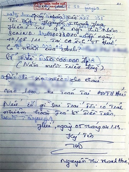 Một giấy biên nhận mà Hoa ghi để lừa nhận tiền của người có nhu cầu xin việc, được công an thu thập. Ảnh: T.B. |
