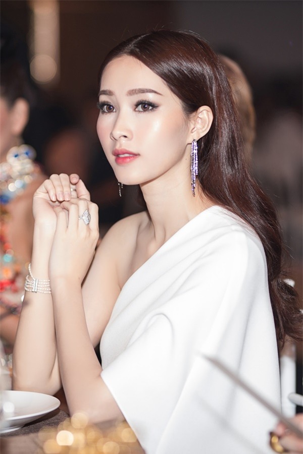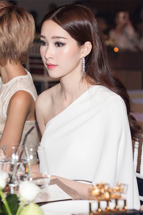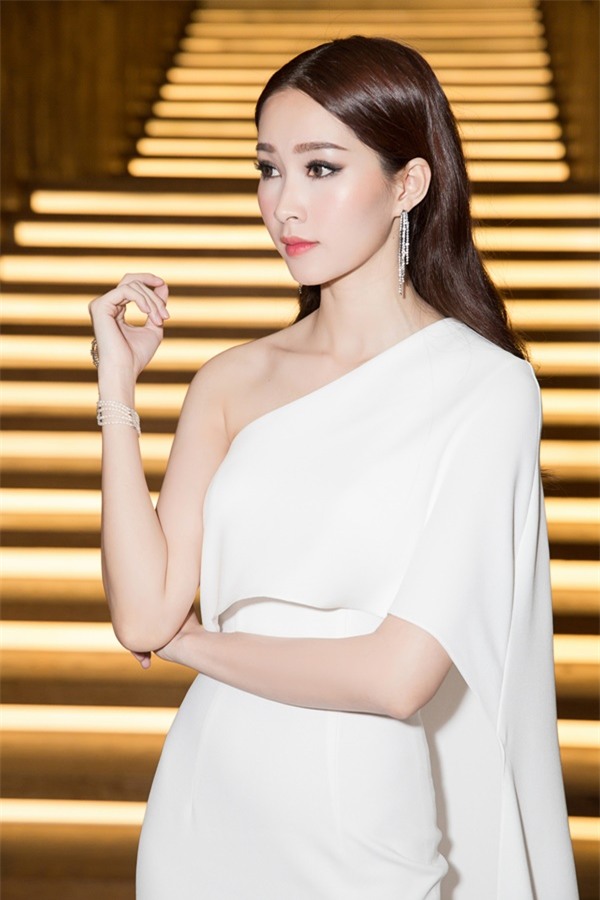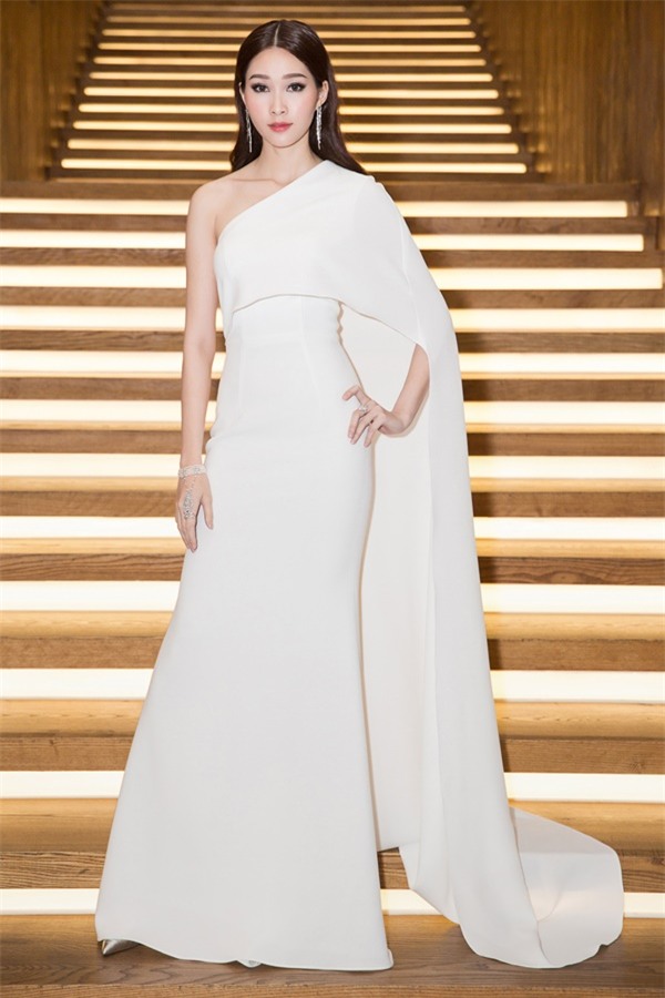 Trong lần lộ diện này, cô khiến quan khách phải xuýt xoa với vẻ đẹp nữ thần dù chỉ diện thuần sắc trắng. Chiếc đầm với thiết kế vai lệch, phần vạt vai dài cùng form dáng ôm của NTK Lê Thanh Hòa không chỉ giúp Hoa hậu sinh năm 1991 lộng lẫy quý phái, mà còn khiến người đẹp tăng khí chất tinh khôi, tao nhã.