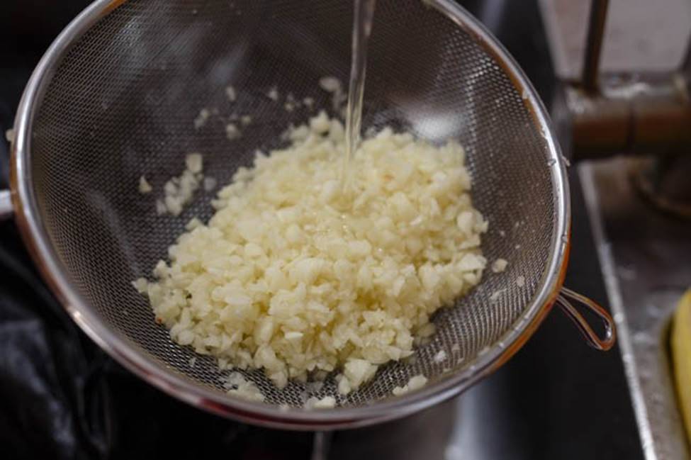 Cho tỏi băm vào rây, xả dưới vào nước lạnh để tỏi bớt hăng. Sau đó để cho ráo bớt nước.