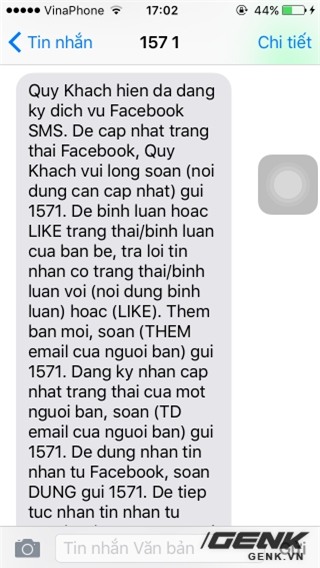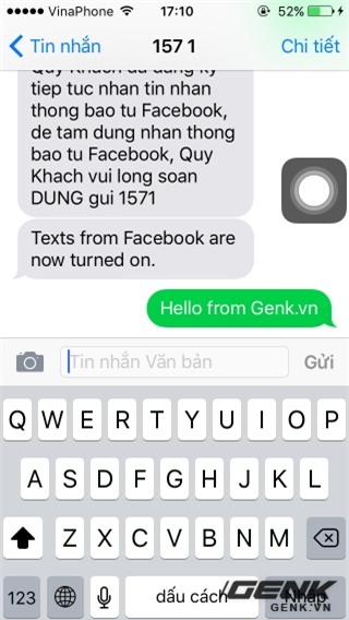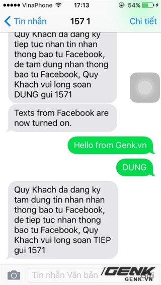 Bước 8: Đăng tải nội dung status từ SMS. Bạn cần nhắn chính xác nội dung cần đăng tải vào đầu số 1571 (dành cho nhà mạng Vinaphone). Ví dụ trong trường hợp này, tôi nhắn nội dung "Hello from Genk.vn".