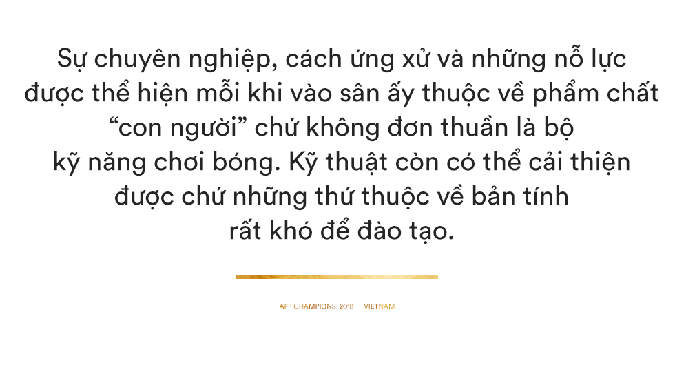 Chúng ta sở hữu cầu thủ hay nhất giải đấu: Nguyễn Quang Hải. Hải “con” đã có một năm 2018 thăng hoa, là nhân tố chủ chốt tại tất cả các đội bóng anh góp mặt: từ U23 Việt Nam, CLB Hà Nội cho tới Đội tuyển Quốc gia. Nhưng tuyển Việt Nam không đơn thuần chỉ có những ngôi sao. Còn đó những người hùng thầm lặng, âm thầm đóng góp đưa đội tuyển ra trước ánh hào quang. Đó là những trợ lý của ông Park Hang-seo, đội ngũ hỗ trợ về mặt ngôn ngữ, thể lực...