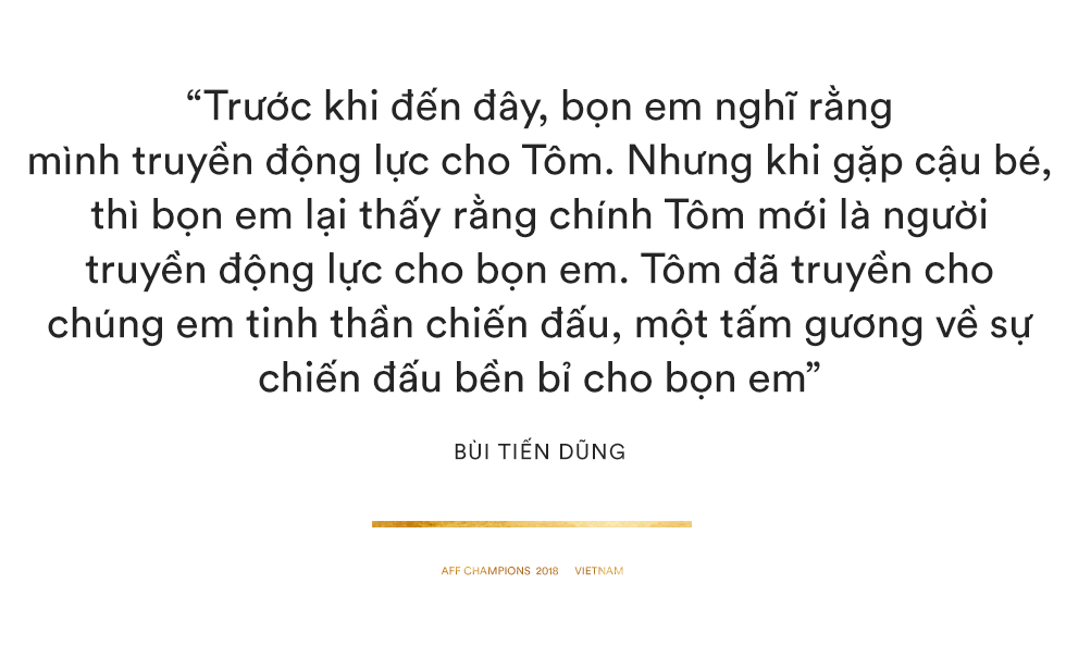 Như cách Bùi Tiến Dũng nói về cậu bé đã trải qua 16 đợt truyền hóa chất dù mới 4 tuổi: “Trước khi đến đây, bọn em nghĩ rằng mình truyền động lực cho Tôm. Nhưng khi gặp cậu bé, thì bọn em lại thấy rằng chính Tôm mới là người truyền động lực cho bọn em. Tôm đã truyền cho chúng em tinh thần chiến đấu, một tấm gương về sự chiến đấu bền bỉ cho bọn em”. Sau khi chơi đùa cùng Tôm, Quang Hải cũng được tiếp thêm động lực: “Có gặp khó khăn nào trên sân cỏ và cuộc sống cũng phải mạnh mẽ vượt qua, tiến lên phía trước”.