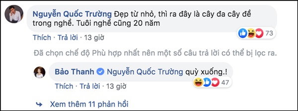 ... Bảo Thanh đã lập tức để lại bình luận trêu chọc nam diễn viên. Tương tác này của cả hai đã thu về vài trăm lượt thích từ dân mạng.