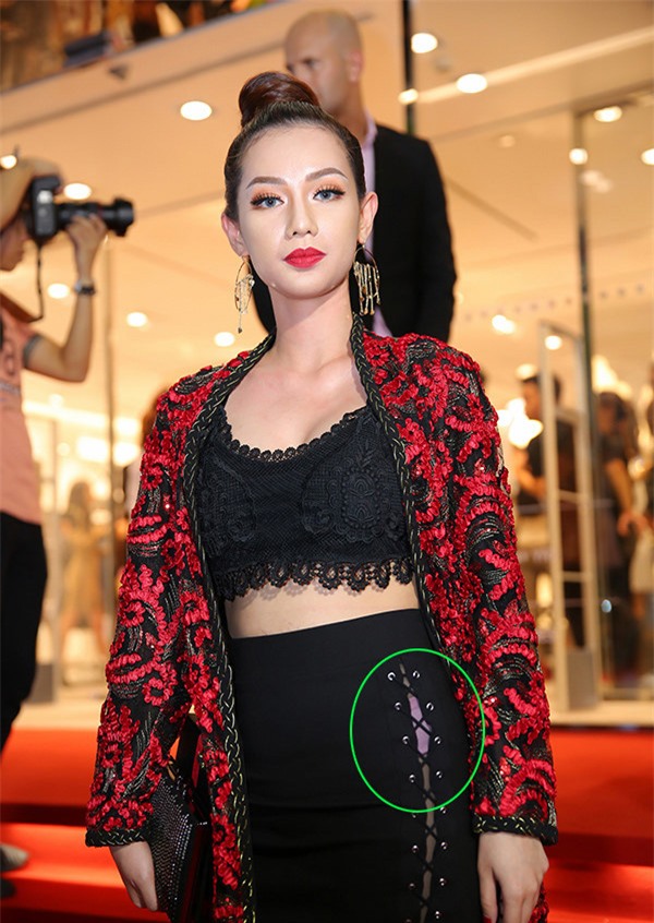 MC Quỳnh Chi lại vô tình để lộ giấu vết của nội y khi diện đầm đan dây dọc bên hông.