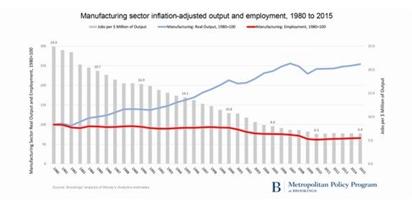 Theo nghiên cứu của Brookings (Mỹ), hàng triệu công việc lao động chân tay sẽ không thể quay về Mỹ, không phải bởi vì nhà máy không chuyển về Mỹ được, mà do bởi các công việc đã được thay thế bởi robot.