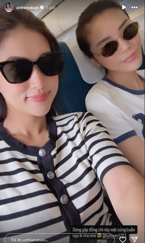 Về phía hoa hậu Hòa bình Việt Nam 2022, người đẹp cũng chia sẻ khoảnh khắc cả hai cùng trên máy bay. Cả hai lền đồ khá đồng điệu với áo thun tông màu xanh than - trắng. Được biết, trong chuyến sang Thái lần này, Thiên Ân được mời tham gia sự kiện của nhãn hàng nước hoa đình đám.