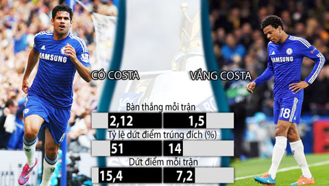 Thành tích của Chelsea khi có và không có Costa ở mùa này