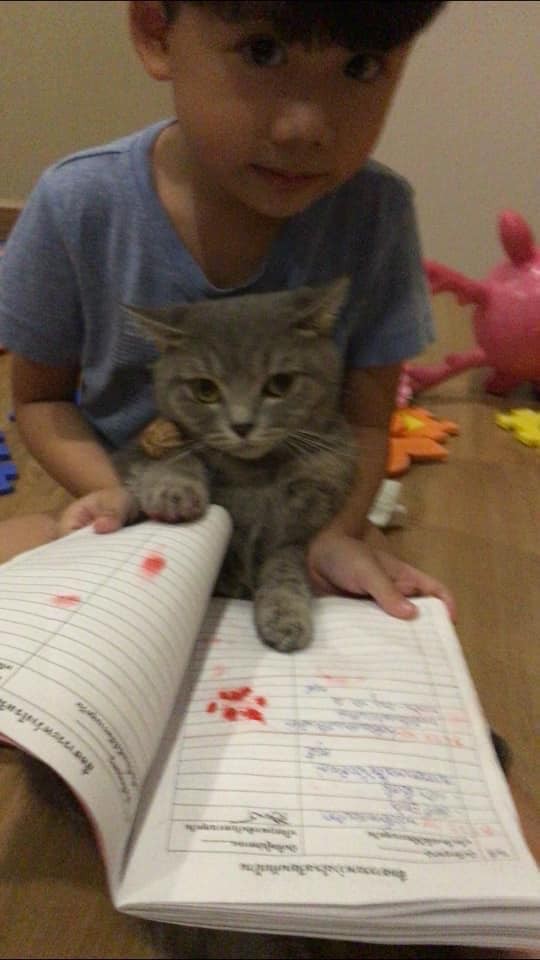 Vì mèo không thể cầm bút nên cậu bé quệt son đỏ rồi đặt bàn chân mèo cho in lên sổ.