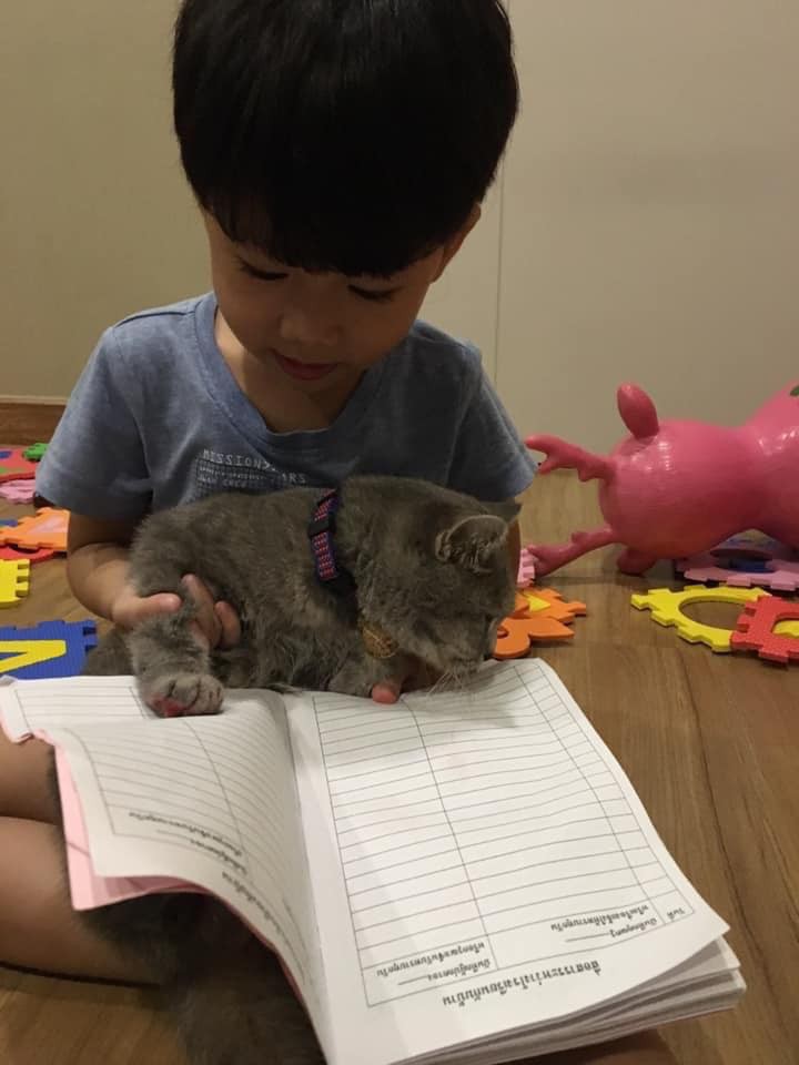 Cậu bé cố gắng ép chú mèo nhà mình giả làm phụ huynh.