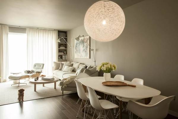 Xám và trắng là gam màu chủ đạo trong căn hộ hiện đại, sang trọng này. Đèn thả trần tròn tinh tế, nhẹ nhàng giúp phân định phòng khách với không gian ăn uống.