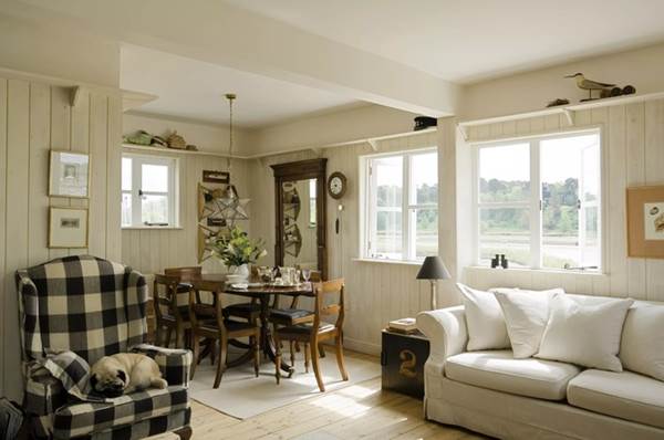 Ngôi nhà kiểu Scotland duyên dáng này có phòng khách kết hợp bếp theo phong cách mở. Phòng khách có 2 ghế sofa in họa tiết kẻ caro màu trắng và be, kết hợp cùng bàn cà phê gỗ tròn mộc mạc cạnh lò sưởi ấm cúng. Khu vực ăn uống cách bàn khách chỉ độ vài bước chân, bài trí bằng bàn ăn gỗ ấm áp và ghế gỗ kiểu đồng quê đơn giản, hài hòa với tông màu vàng và màu be của căn phòng.