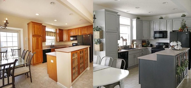 Ví dụ cuối cùng về việc màu sơn có tác dụng lớn đến nội thất và không gian như thế nào, trước kia phòng bếp trông cũ kỹ với tủ bếp và gạch lát sàn màu tối. Sau khi cải tạo, màu trắng đã mang lại khu bếp một hơi thở hoàn toàn khác.
