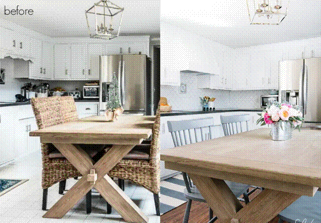 Trước khi cải tạo, căn bếp khá cũ kỹ và luộm thuộm. Nhưng chỉ bằng cách sơn trắng lại và đổi một bộ bàn ăn đơn giản phù hợp hơn, không gian đã trở nên rộng rãi và trẻ trung hơn nhiều.