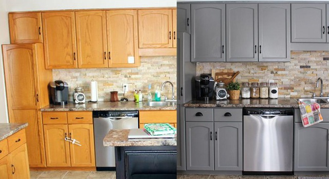 Lo lắng vì ngân sách hạn hẹp, hãy thử ý tưởng cải tạo bếp của gia đình này: sử dụng giấy dán để thay đổi màu tủ và thay chạn treo tường loại có kính. Ngay lập tức, khu bếp trở nên sang trọng và ấn tượng hơn hẳn trước kia..