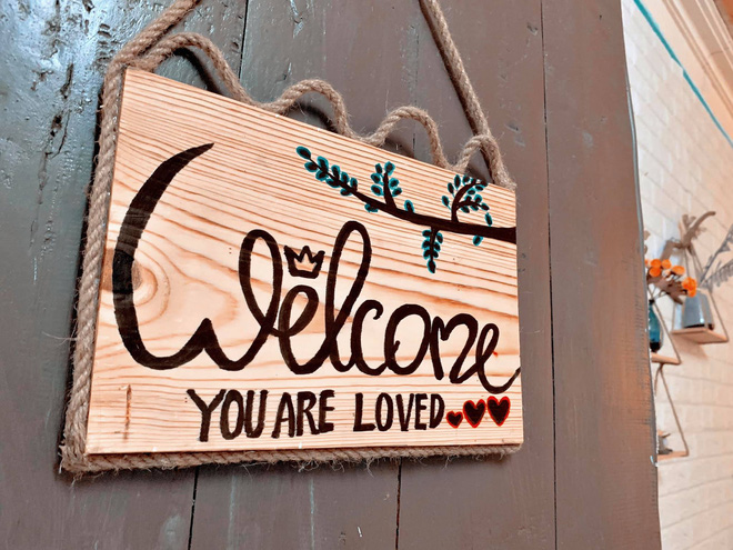 - Đồ trang trí như kệ treo, biển treo, tranh ảnh thì nên tự làm, vừa ý nghĩa lại tiết kiệm rất nhiều chi phí. Nguyên liệu có thể đặt từ Taobao, Shopee,... Riêng thanh củi ngang của những chiếc kệ treo là chồng Nguyệt nhặt từ đơn vị về cho.