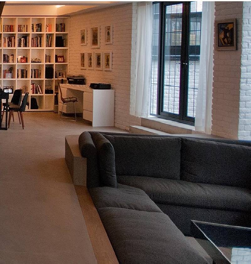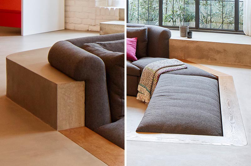 Phía sau ghế sofa là một phần bê tông được xây cao hơn sàn nhà để đỡ lưng ghế sofa.