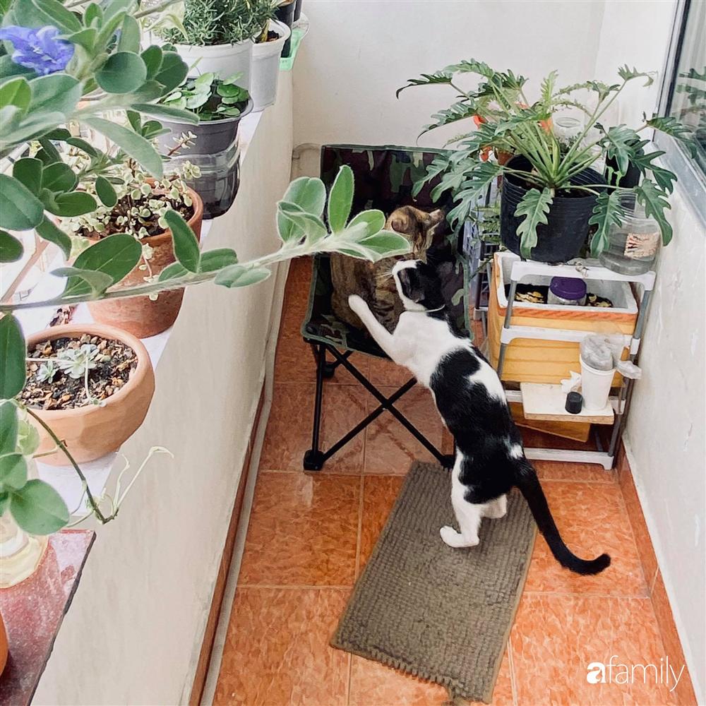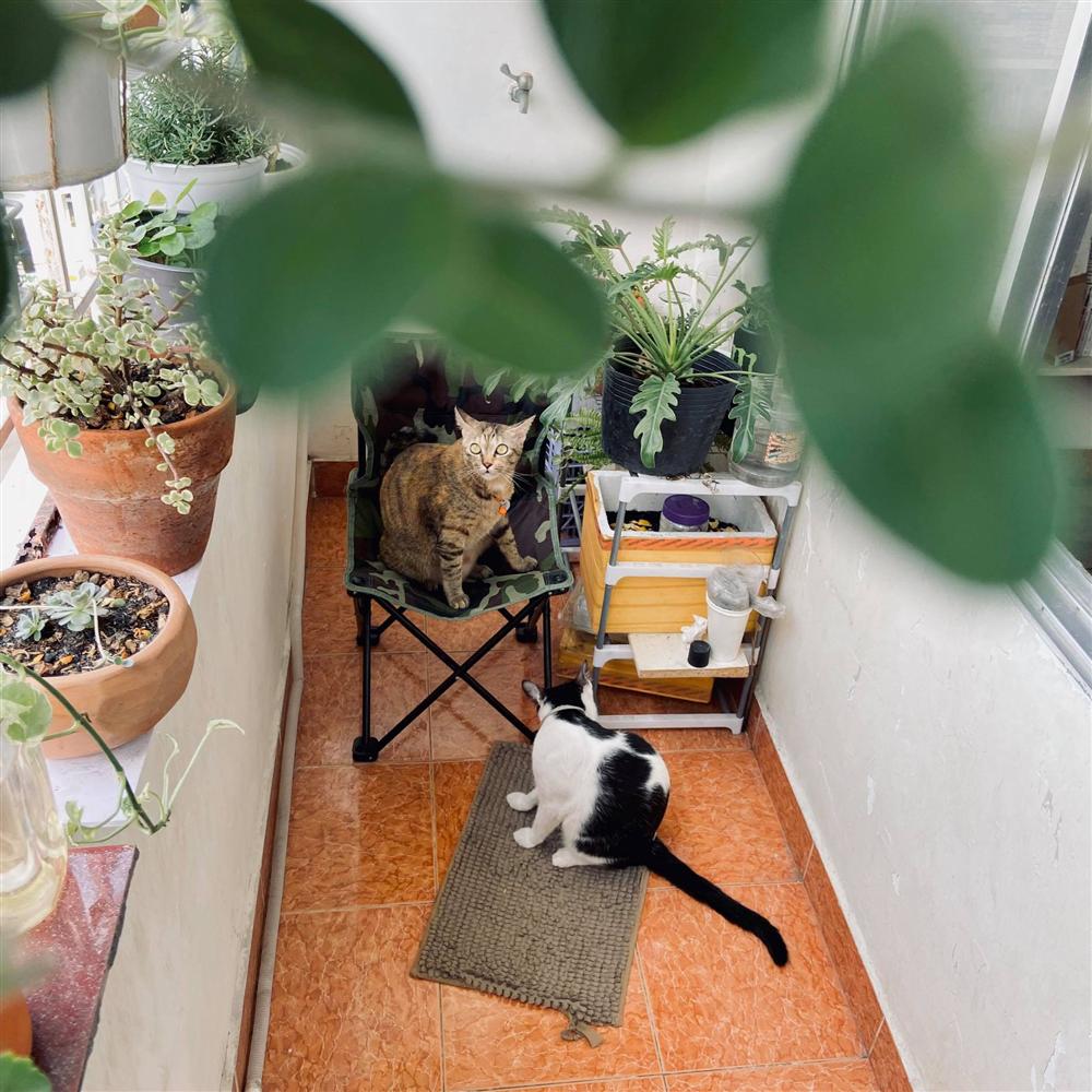 Hai chú mèo lười là bạn của chàng trai khi chăm sóc ban công nhỏ.