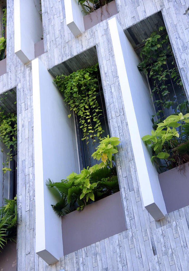 Những tấm bê tông này được kết hợp một cách hoàn hảo để tạo nên những ô cửa sổ dọc dài ở mặt tiền nhằm mục đích trồng thêm cây xanh trang trí, giảm tiếng ồn và ô nhiễm.