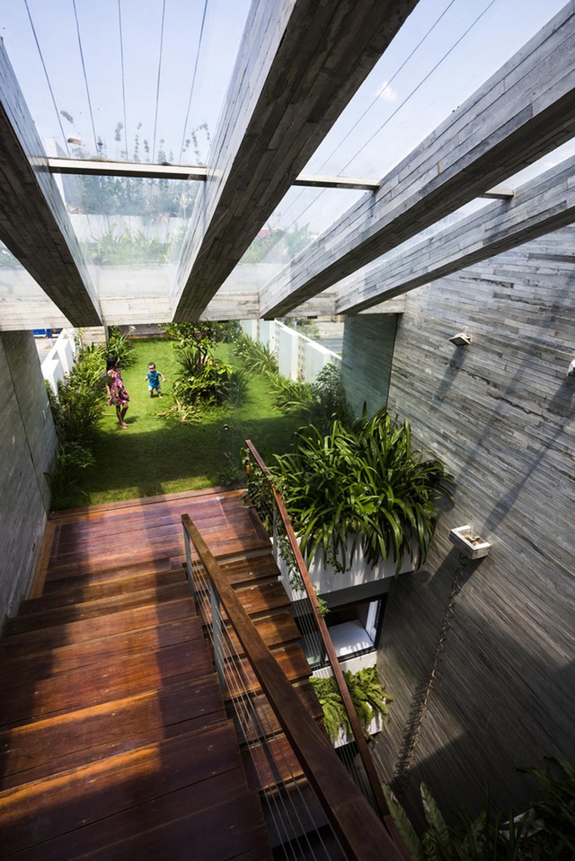 Tất cả các hoạt động và không gian của gia đình đều tập trung xung quanh và liền kề với khu vườn trung tâm: phòng khách, phòng ăn, khu vực tập thể dục, trò chuyện, đọc sách và nghỉ ngơi.