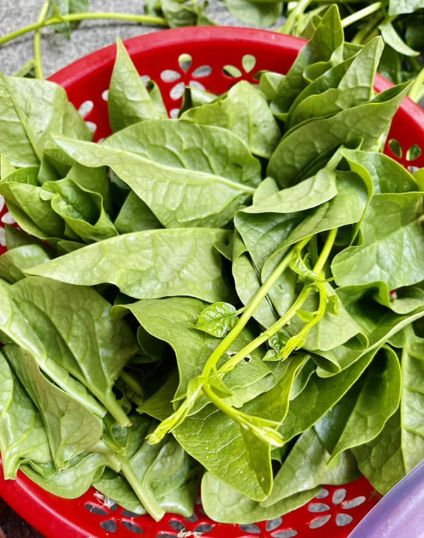 Bà Hương khoe thành quả trồng trọt của bản thân là rổ rau mồng tơi hữu cơ tươi non.'TP HCM mùa hè nắng nóng làm vườn khá vất vả. Nhiều hôm tôi vừa làm vừa lau mồ hôi đầm đìa khắp mặt. Dù vậy, tôi vui khi ngắm mảnh vườn nhỏ tươi tốt mỗi ngày', bà Hương nói.