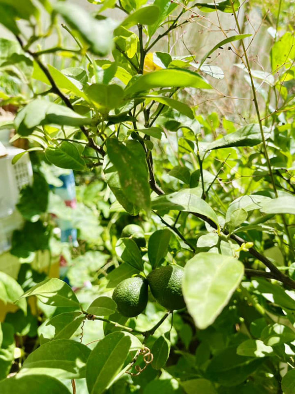 Ngoài các loại rau ăn lá như rau lang, mồng tơi, mẹ Hồ Ngọc Hà còn trồng một số loại cây, rau gia vị như chanh, sả, ớt. Bà Hương cho biết cây chanh của gia đình đã ra 10 trái đầu tiên.