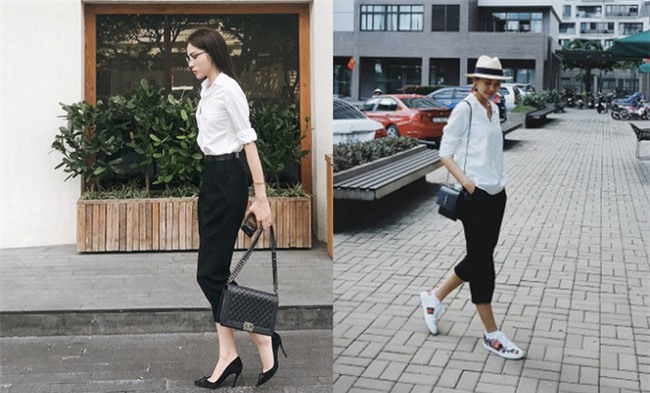 Cái cách mà Kỳ Duyên mix sơmi trắng và quần âu, tuy có khác Thanh Hằng nhưng cũng cho thấy sự đồng điệu phong cách của cả hai. Kỳ Duyên gọn gàng chỉn chu khi sơvin và xỏ chân trong đôi cao gót sang chảnh còn Thanh Hằng đúng chất menswear khi buông hờ sơmi và đi sneaker năng động.