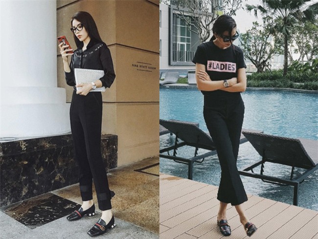 Đầu tiên phải kể đến set đồ đen nguyên cây này của hai người. Nếu như Kỳ Duyên kết hợp sơmi đen cùng quần âu thì Thanh Hằng thoải mái hơn khi diện áo phông với quần âu lửng gấu. Điểm đáng chú ý là cả hai người đều chọn đôi loafer Gucci hoàn thiện set đồ của mình.