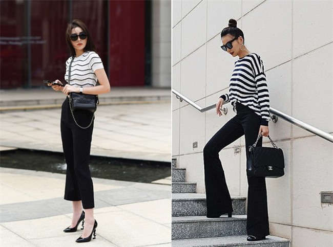 Cùng một set đồ áo phông kẻ ngang và quần đen, cả Kỳ Duyên và Thanh Hằng đều chọn túi Chanel nhưng mỗi người một thiết kế khác nhau. Tổng thể có sự đồng điệu chỉ khác nhau phong cách mà hai người đẹp thể hiện, Kỳ Duyên trẻ trung thoải mái thì Thanh Hằng lại cổ điển và thời thượng.