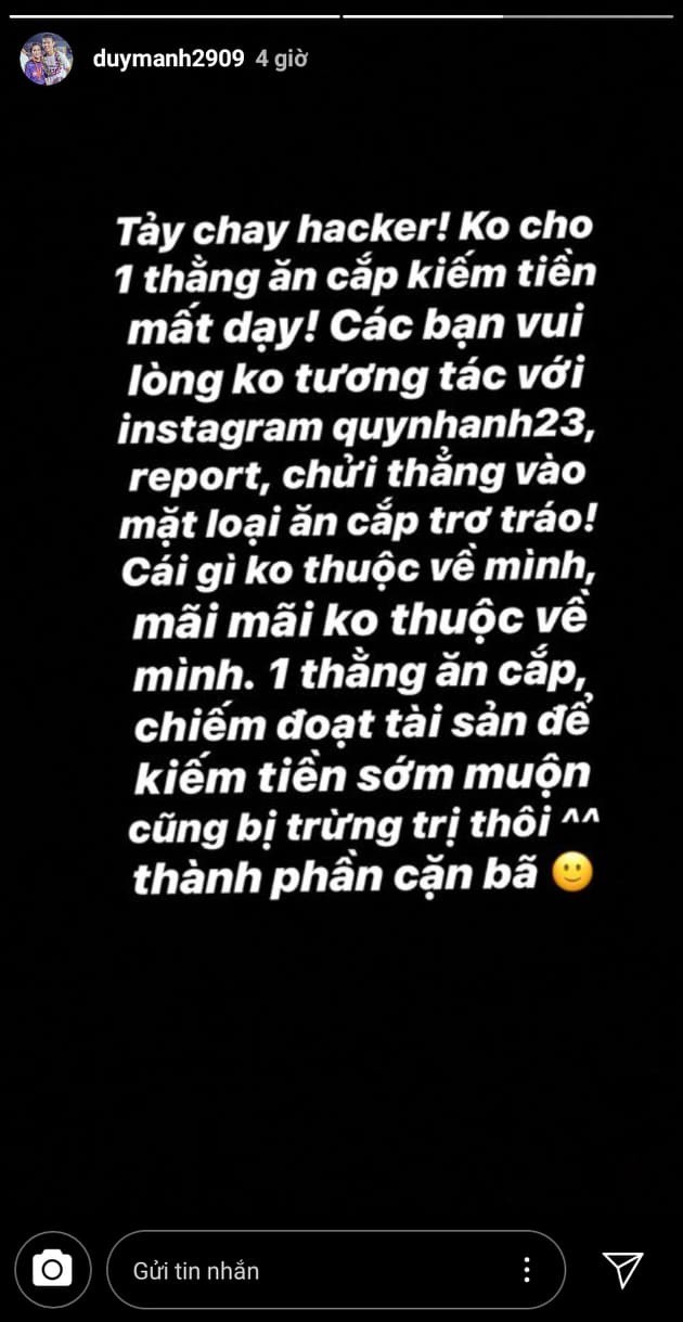 "Tẩy chay hacker. Các bạn vui lòng không tương tác với Instagram @quynhanh23, report, chửi thẳng vào mặt loại ăn cắp trơ tráo. Cái gì không thuộc về mình thì mãi mãi không thuộc về mình. Ăn cắp, chiếm đoạt tài sản để kiểm tiền sớm muộn gì cũng bị trừng trị thôi."
