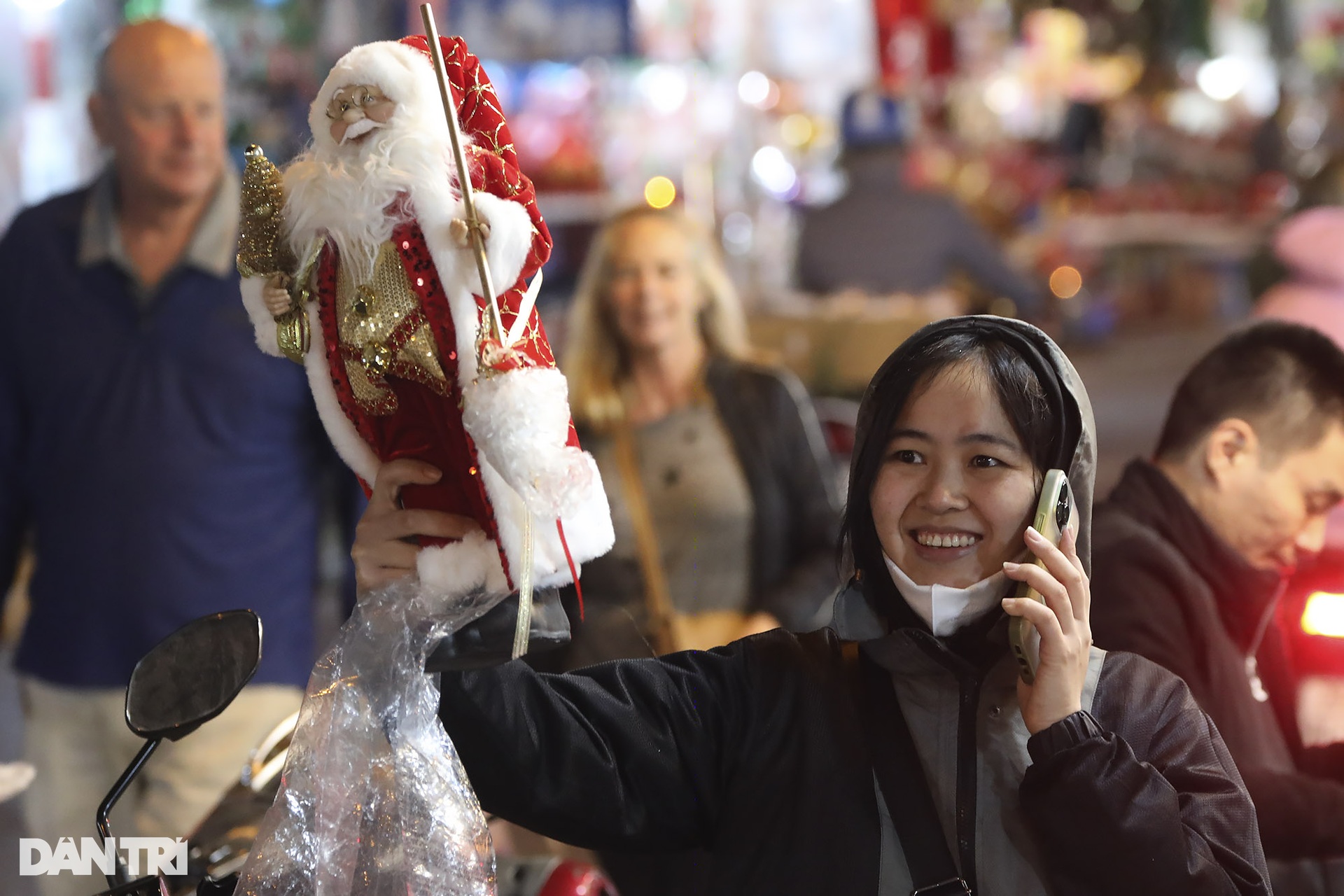 Đồ trang trí Giáng sinh tại phố Hàng Mã rất đa dạng, nhiều mẫu mã, kiểu dáng. Có loại giá cả hợp lý, chỉ vài chục nghìn đồng. Nhưng cũng không ít những món trang trí có giá lên tới hơn chục triệu đồng. Trong ảnh là một khoảnh khắc khách mua hàng vui vẻ chọn lựa ông già Noel tại chợ Hàng Mã.