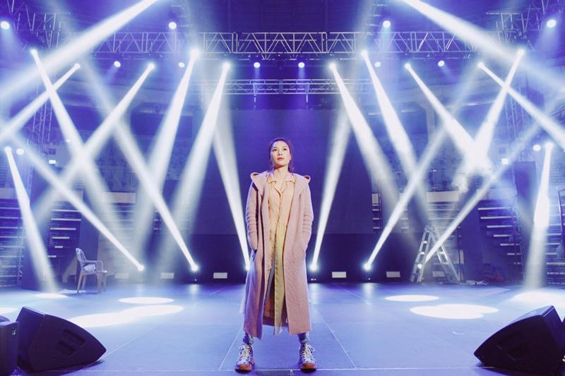Sử dụng lại tuyệt chiêu diện giày sneaker để trông đôi chân thanh thoát hơn, đồng thời nữ ca sĩ sử dụng bộ suit đen freesized để tạo nên sự thon gọn cho tổng thể.