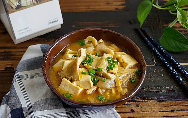 Phi thơm gừng tỏi, cho đậu phụ vào, đảo vài lần để khỏi dính đáy nồi, thêm lượng nước vừa phải rồi cho nấm vào, đun lửa nhỏ trong 1 phút.