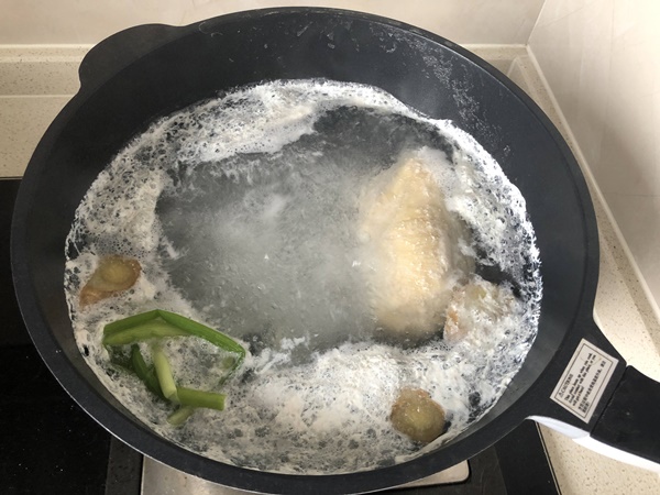 1. Ức gà tươi rửa qua nước sạch trước, sau đó cho vào nồi nước lạnh, đồng thời cho hành tím và gừng vào, nấu ức gà đến khi gần chín, khoảng 10 phút là được.
