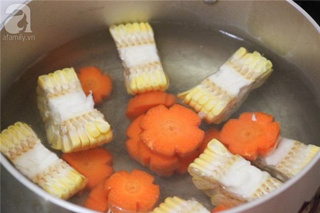 Sử dụng luôn nồi nước trần lá bắp cải lúc đầu. Cho cà rốt và ngô ngọt vào nồi đun đến khi sôi thì vặn nhỏ bếp.