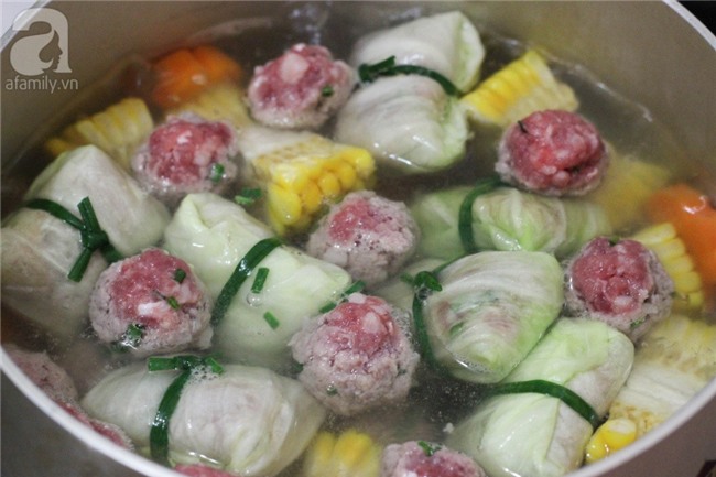 Tiếp tục cho bắp cải cuộn thịt và thịt viên vào nồi đun đến khi thịt chín, nêm nếm gia vị cho vừa ăn.