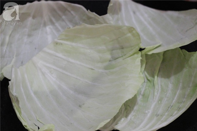 Bắp cải tách thành từng lá, bỏ phần cuống cứng, rửa sạch.