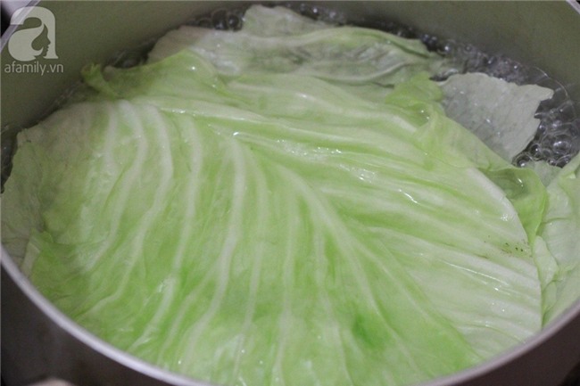 Đun nồi nước sôi, cho lá bắp cải và vài cọng hành lá vào chần sơ cho mềm.
