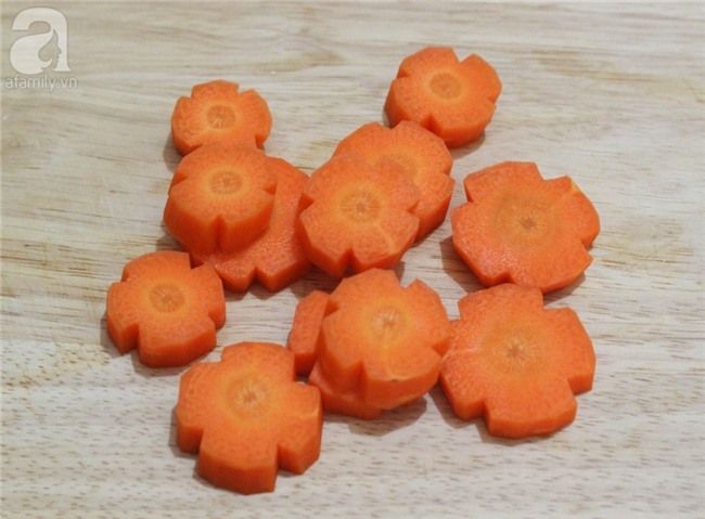 Cà rốt gọt vỏ, tỉa hoa, cắt cà rốt thành từng miếng dày khoảng 0.3cm.