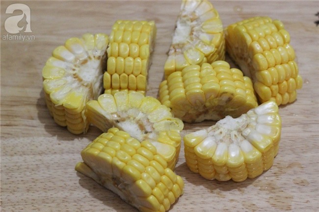 Ngô ngọt bóc bỏ vỏ, cắt thành từng khoanh dày khoảng 2 - 3cm, sau đó tiếp tục cắt đôi từng khoanh ngô.