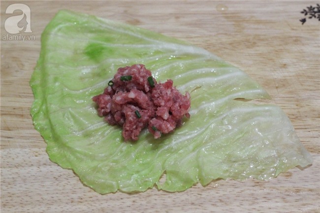 Trải lá bắp cải ra thớt, cho nhân thịt vào giữa rồi gói lại.
