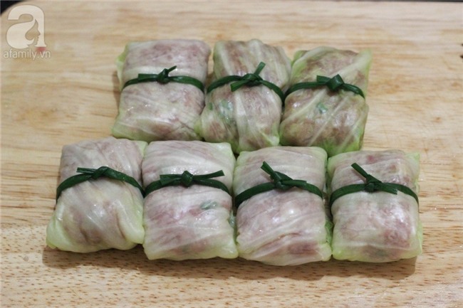 Dùng cọng hành lá đã trần sơ để buộc miếng bắp cải cuộn thịt lại.