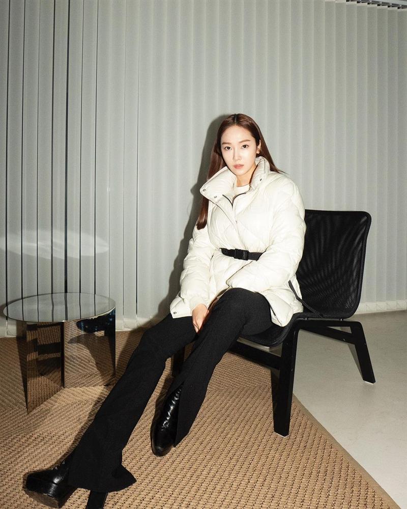 Khác với người chị sang chảnh của mình, Krystal Jung trẻ trung đơn giản với áo khoác bông ấm áp, nhìn mỏng manh thế thôi nhưng chất vải giữ ấm cực đỉnh. Krystal chỉ cần quàng thêm khăn và mũ len là đủ giữ ấm cho mình.