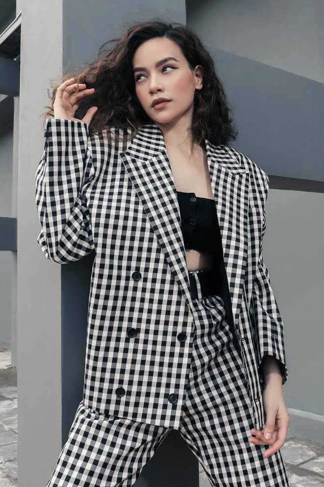 Mái tóc ngắn được uốn xoăn lọn nhỏ, đánh rối rồi chải ngôi lệch sang một bên giúp cho Hà Hồ trở nên bản lĩnh và quyến rũ vô cùng.